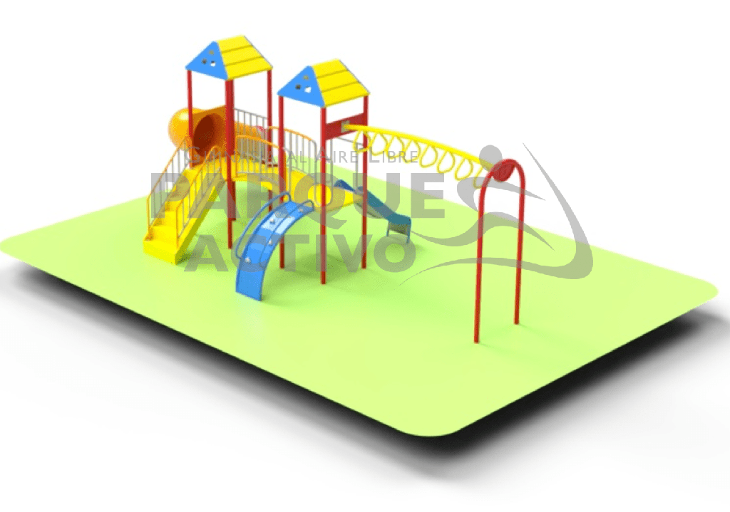 Estación de juego infantil con componentes de alta calidad, con diseño innovador, resistente, duradero y seguro, específicamente para el uso en espacios públicos donde se espera un alto tráfico de niños, proporciona una experiencia de juego divertida y estimulante, fomentando el desarrollo físico, social y emocional.